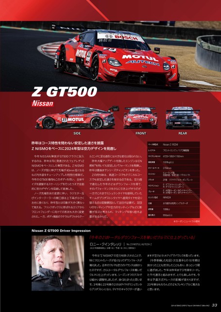 ベース車型式NissanZ(RZ34)レイアウトフロント・エンジン/リア2輪駆動サイズ(L×W×H)4725×1950×1150mm最低車重1020kg以上ホイールベース2750mmミッションヒューランド製前進6速/後退1速/パドルシフトクラッチZF製クアドラブルカーボンプレートサスペンションF:ダブルウィッシュボーンR:ダブルウィッシュボーンブレーキF:AP製カーボン6ポッドキャリパーR:AP製カーボン4ポッドキャリパーエンジン型式NR4S24仕様水冷直列4気筒シングルターボ排気量1998cc最大馬力550ps以上今年NISSAN陣営がGT500クラスに投入するのは、昨年8月に発表されたフェアレディZNISMOをベースにした車両である。ZNISMOは、ノーズが前に伸びて先端が40mm低くなるなど内外装をチューンアップした特別仕様車だ。今年のGT500車両もこのボディを用い、全体サイズを調整するスケーリングを行ったうえで全面的に空力デザインを見直して変身した。ノーズ先端形状の変更に伴い、ラジエター及びインタークーラーの開口部は上下高が小さく左右に長くなり、昨年型とは印象が大きく異なって見える。フリックボックスと呼ばれるエリアからフロントフェンダーに向けての形状も大きく変更された。一方、ボディ側面のラテラルダクトからテールエンドに至る造形には大きな変化は見られない。昨年大幅アップデートを施したエンジンはCN燃料※を用いても安定したパフォーマンスを発揮し、昨年は最後までシリーズチャンピオンを争った。Zの持ち味は、高速コースでもテクニカルコースでも安定した速さを見せる点である。空力面で進化した今年のZはダウンフォースを得て、そのパフォーマンスをさらに引き上げそうだが、一方でこれまでミシュランタイヤを使用していたチームがブリヂストンタイヤへ使用タイヤを切り替える点は変動要因として注目が必要だ。足回りのセッティングや空力のセッティングなどに影響が及ぶと考えられ、マッチングを取り直す必要があるからだ。昨年はコース特性を問わない安定した速さを披露ZNISMOをベースに2024年型は空力デザインを見直し「今年のZはトータルダウンフォースを稼いだクルマに仕上がっている」ロニー・クインタレッリ|No.23MOTULAUTECHZ2023年開幕戦岡山:決勝1位/予選1位(共にZ最高位)今年は“ZNISMO”の空力を採り入れたことで、特にフロントのノーズが低くなってダウンフォースが増えました。去年のクルマも空力のバランスは良かったのですが、さらにトータルダウンフォースを稼いだクルマに仕上がっています。シーズンオフのテストでは細かい調整をしましたが、良くまとまったと思います。3号車と23号車の2台はタイヤがミシュランからブリヂストンになり、タイヤのキャラクターが違いますが空力とセットアップでバランスを取っています。(今季移籍した松田)次生選手との10年間は良かったことも苦労したこともあり、あっという間に過ぎました。今年は昨年まで3号車をリードした千代選手と組みますが、とても楽しみです。今年は予選方式やレースの距離が変わりますが、23号車はもちろんどのZもフレキシブルに戦えると思います。NissanZGT500DriverImpressionZGT500Nissan※カーボンニュートラル燃料SIDEFRONTREAR33